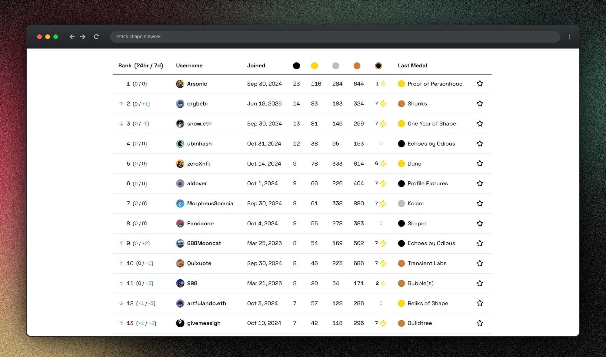 On the Stack, shapers earn medals for participating in projects on Shape, as well as from being members of onchain communities. Medals have four tiers: Black, Gold, Silver, and Bronze, and these medals are used to determine shaper's Leaderboard ranks.